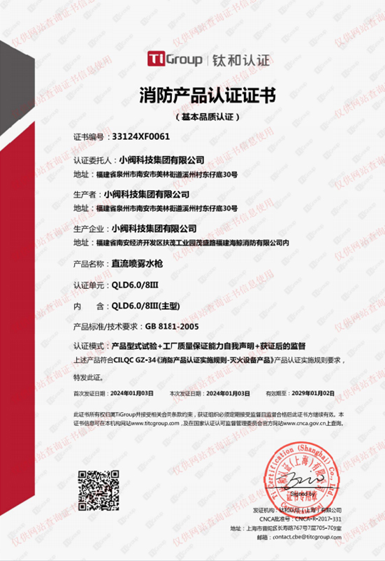直流喷雾水枪消防产品认证证书