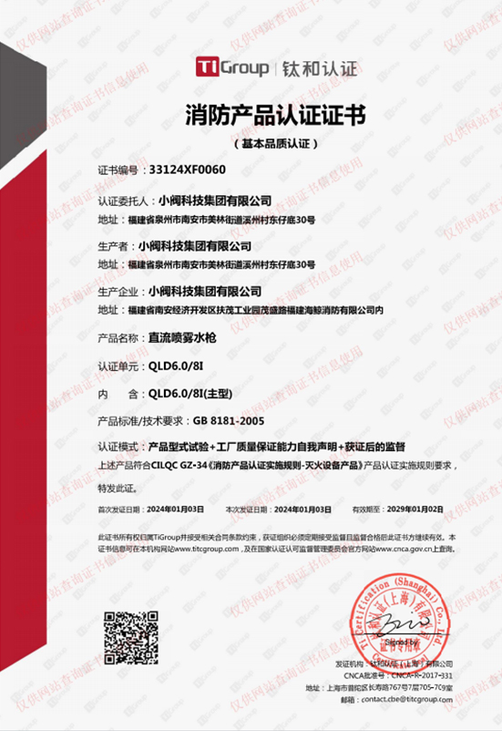 直流喷雾水枪消防产品认证证书